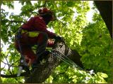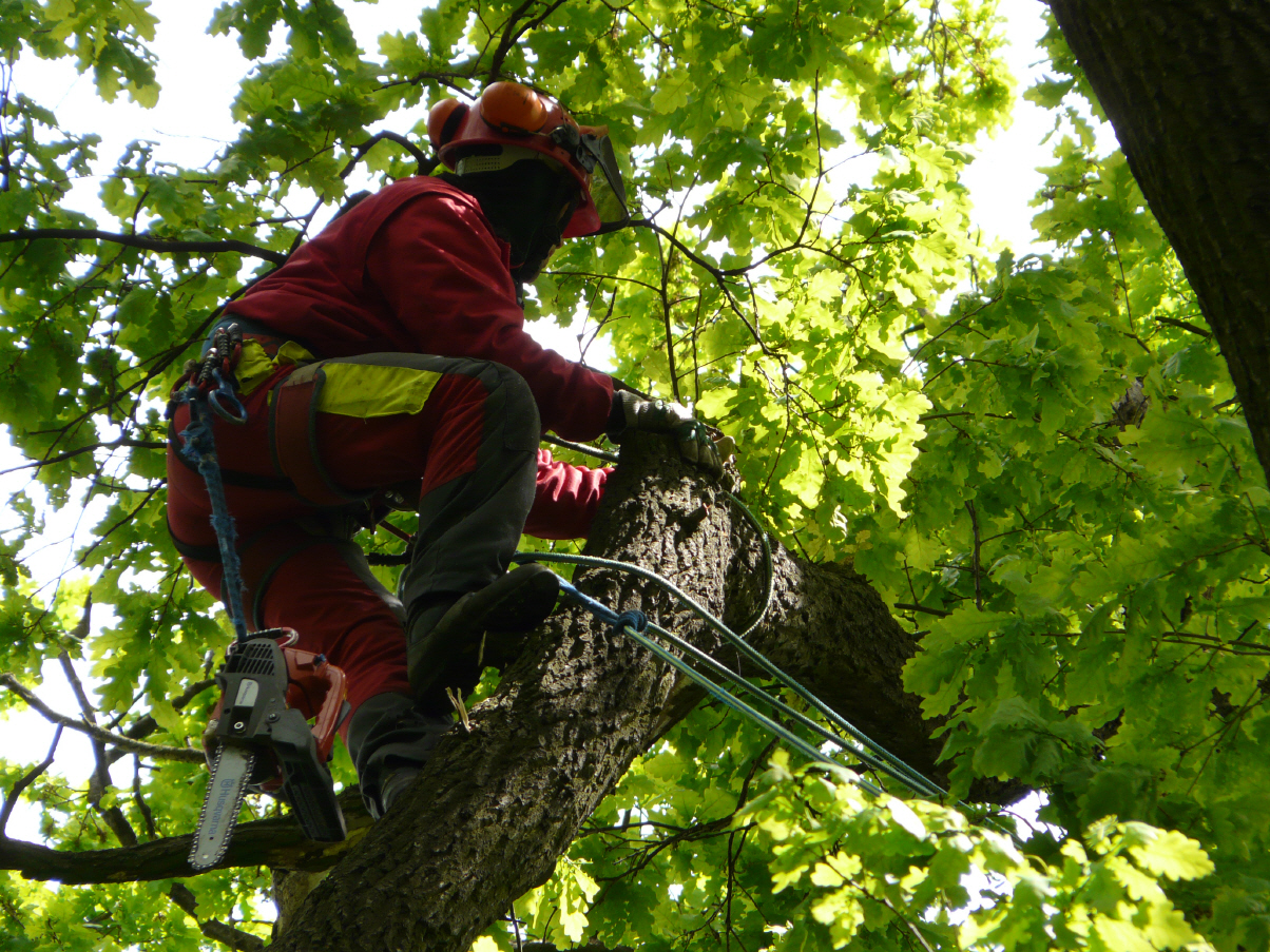 Der Eichenwald in der Nähe eines Siedlungsgebietes in Stemwede wurde von Bewohnern zur Erholung genutzt; schmale Wanderwege führten hindurch. Da eine erhebliche Gefährdung durch Holzschlag bestand, mussten die trockenen Äste saniert werden. Eine Zufahrtsmöglichkeit mit einem Hubsteigerfahrzeug bestand nicht. So konnte die Aufgabe nur mittels professioneller Klettertechnik erledigt werden.